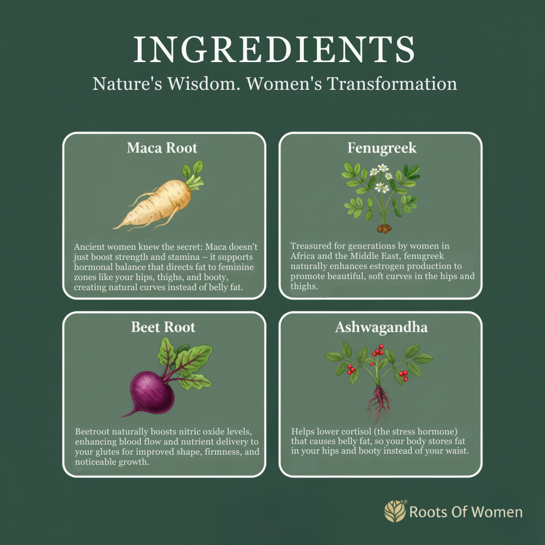 Roots of Women is a natural dietary supplement featuring high-potency Peruvian maca root extract. It's specifically formulated to support women's natural curve development, hormonal balance, and energy enhancement – completely without surgery or synthetic hormones.